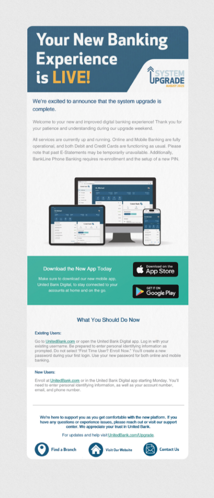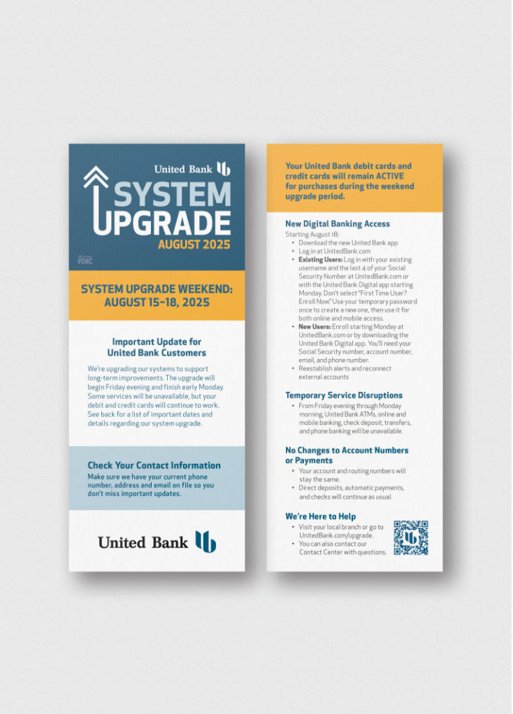 United Bank turned a complex system upgrade into a calm, well-communicated transition. With clear messaging across in-branch, print, and digital channels, customers knew what to expect and when. The conversion went smoothly, and the the bank rolled out the upgrade without unnecessary noise or confusion.
